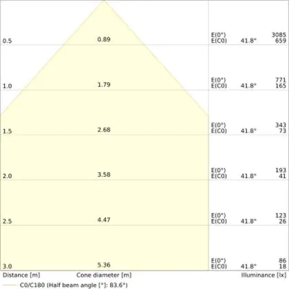 De gradenbundel geeft informatie over hoe breed het licht wordt uitgestraald. Dit zit tussen de 0 en 360 graden (D). Hoe kleiner de hoek, hoe specifieker de lichtbundel is. Over het algemeen is een smalle gradenbundel perfect voor sfeer- of accentverlichting, terwijl een brede gradenbundel ideaal is om grote oppervlaktes te verlichten.
