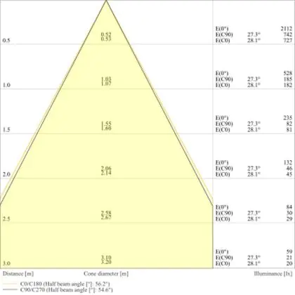 De gradenbundel geeft informatie over hoe breed het licht wordt uitgestraald. Dit zit tussen de 0 en 360 graden (D). Hoe kleiner de hoek, hoe specifieker de lichtbundel is. Over het algemeen is een smalle gradenbundel perfect voor sfeer- of accentverlichting, terwijl een brede gradenbundel ideaal is om grote oppervlaktes te verlichten.